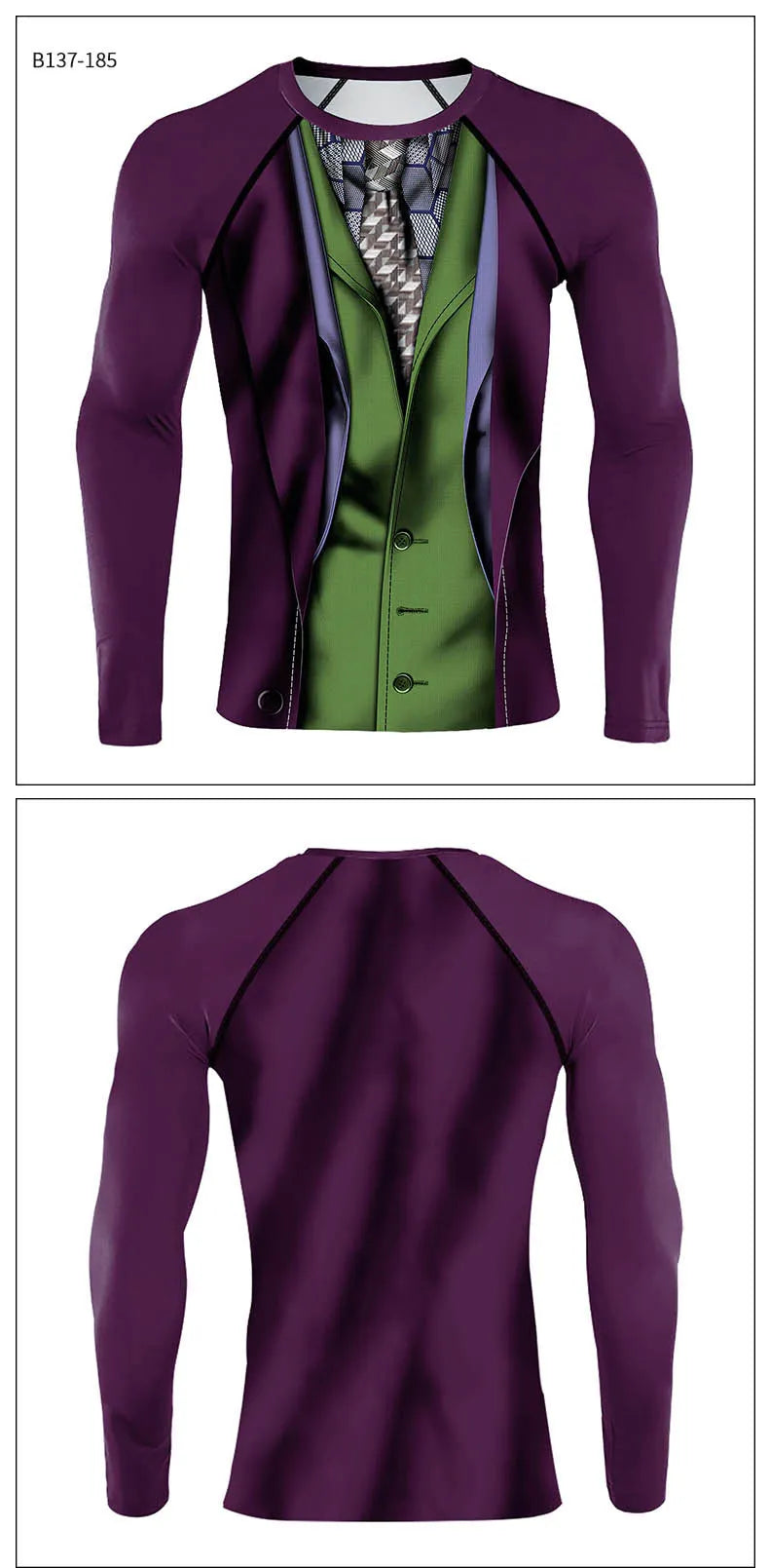 Elevate your performance and style with the Joker 'Dark Knight | Suit' Long Sleeve Compression Rashguard. This premium compression shirt is designed not just to enhance your workouts but to boost your confidence as you unleash your inner superhero. Crafted from a blend of high-quality polyester and spandex, this rashguard ensures a snug yet flexible fit that allows for maximum mobility during all your physical activities.