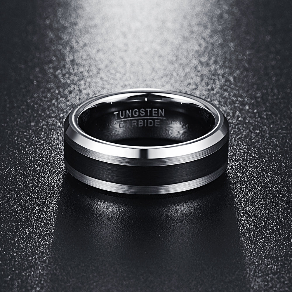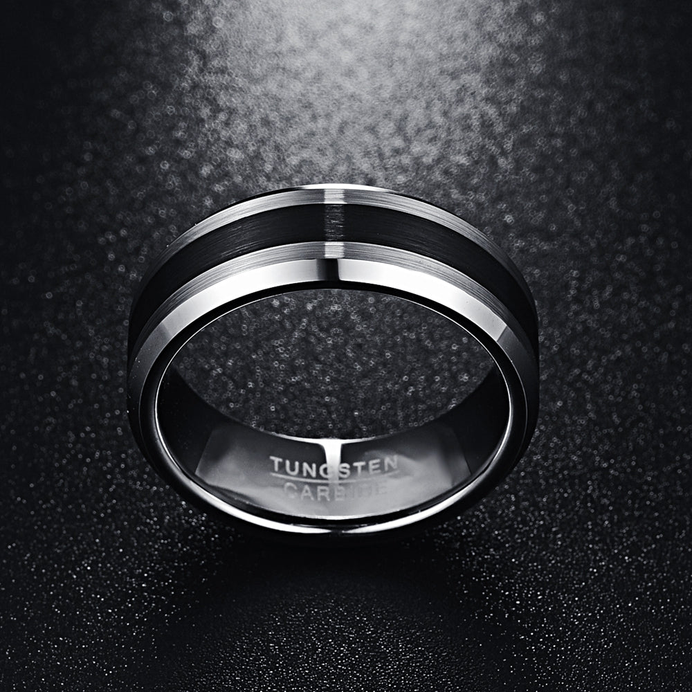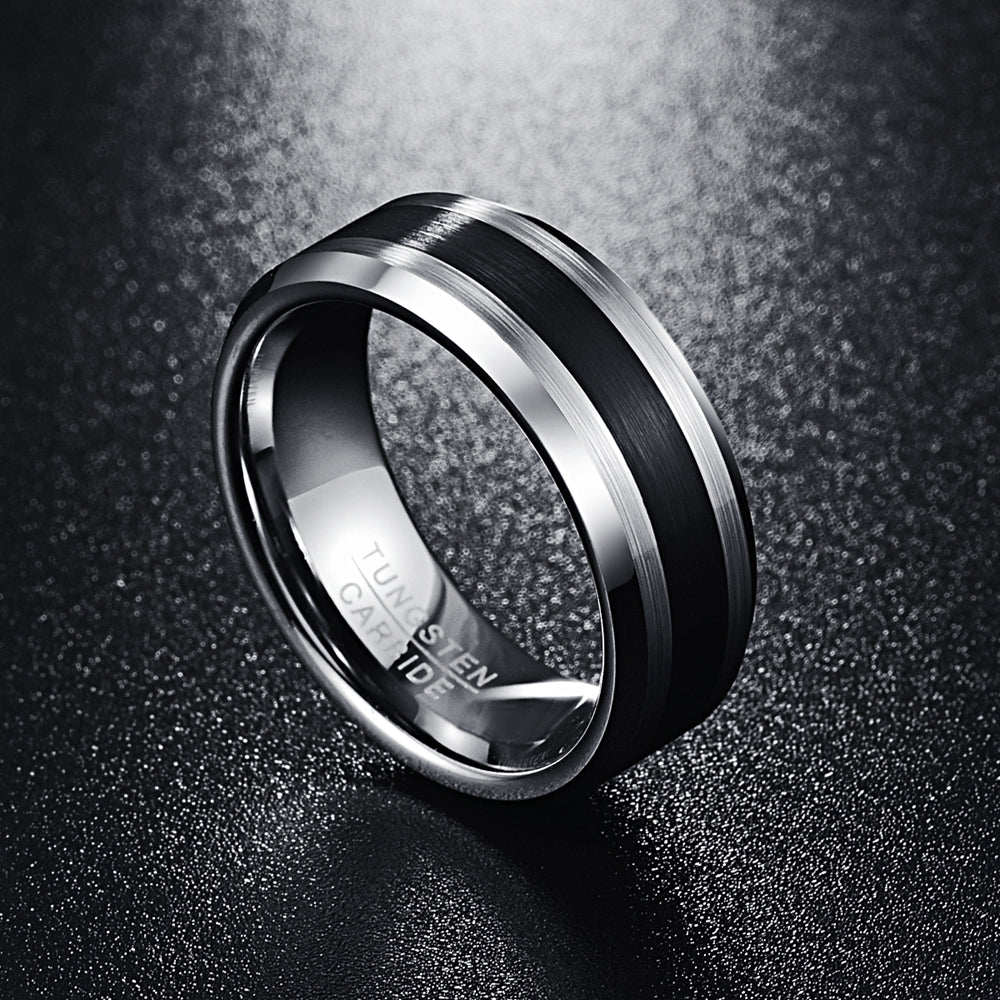 Order your Men's 8mm Brushed Finish and Black Center Beveled Edge Tungsten Carbide Ring today!