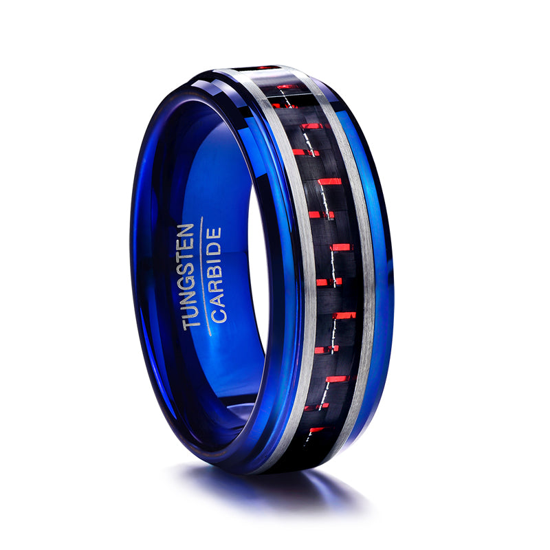 Order your Men's 8mm Inlaid Red Carbon Fiber Blue Tungsten Carbide Ring today!