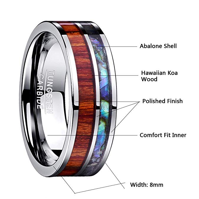 Men's 8mm Inlay Wood and Opal Polished Tungsten Carbide Description: