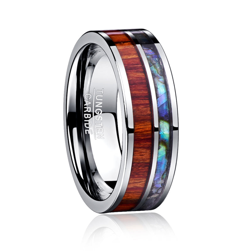 Order your Men's 8mm Inlay Wood and Opal Polished Tungsten Carbide today!