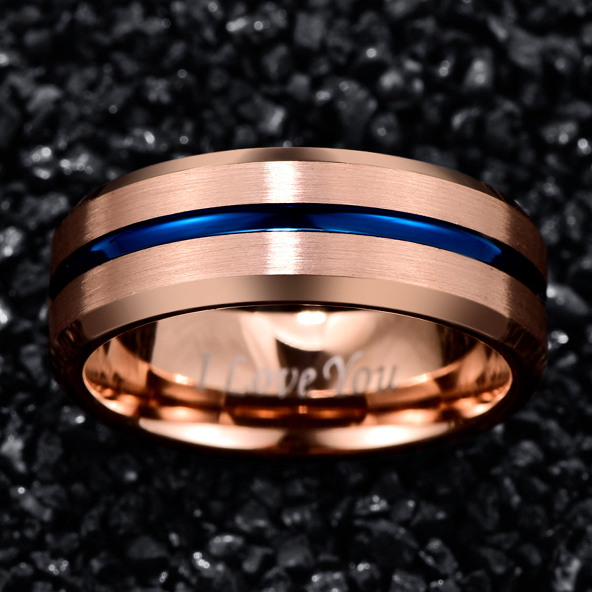 Men's 8mm Rose Gold Blue Groove Inner Tungsten Carbide Ring Description: