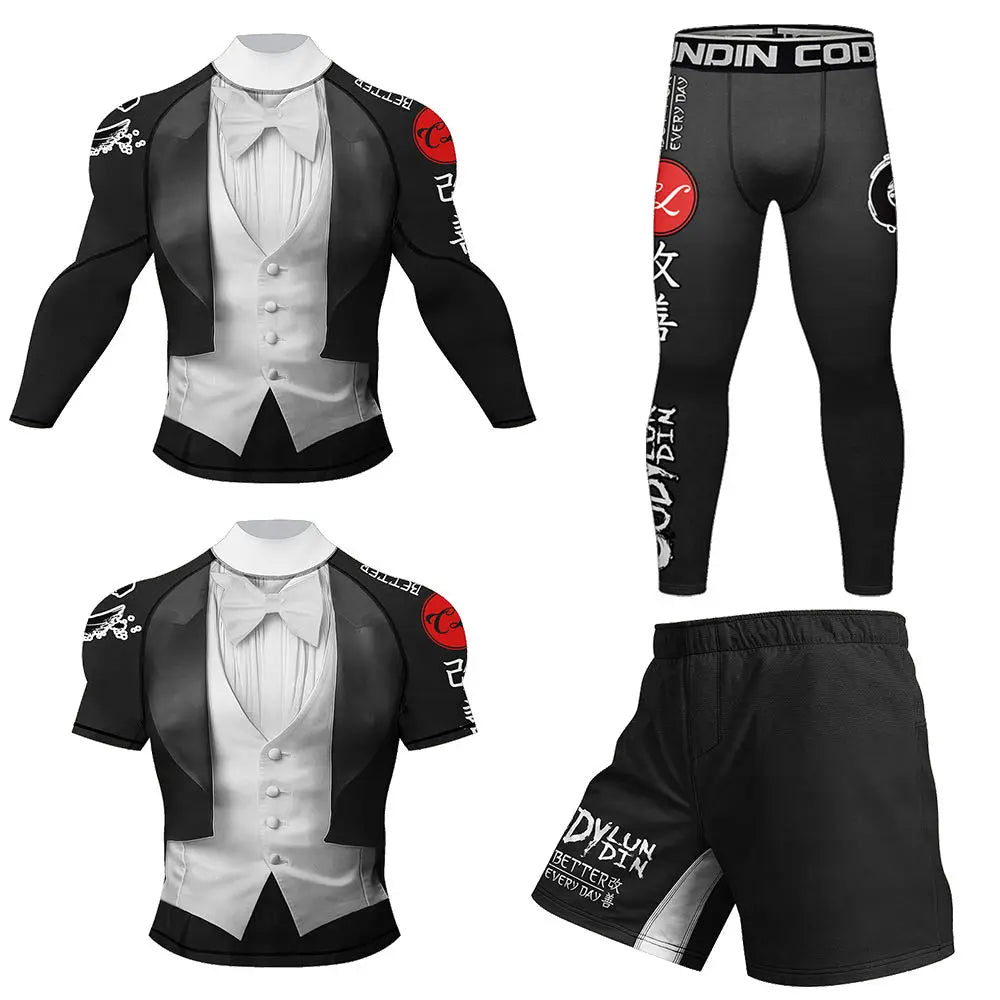 Finally, formal wear for the fight game. Introducing our Tuxedo Elite Compression Rashuard Set —says “I’m here to roll… but make it classy.” Perfect for BJJ, MMA, weightlifting, or any gym activity where you want to feel like James Bond mid-triangle choke.Crafted from sleek, breathable fabric, fits like a glove and performs like a grappling butler. The four-way stretch lets you move effortlessly from armbar to after-party (though we recommend showering first). Flatlock stitching means no chafing, no fuss — just smooth, gentlemanly domination.The tuxedo print? Sublimated to perfection. No fading, no cracking — just a crisp bow tie and lapels that scream refined violence. You'll look like you just stepped out of a gala and directly into a no-gi death match. Who says you can’t sweep guard in style?Whether you're hitting the mats or the squat rack, our Tuxedo Elite Compression Rashuard Set tells your opponents know one thing: you may break bones, but you’ll never break dress code. Because nothing says “I mean business” quite like a tux — especially one you can choke someone in.Dress to impress. Grapple to win. Violence, but make it fashion.Order your Tuxedo Elite Compression Rashuard Set today!Style: Tuxedo Elite Compression Rashuard SetMaterial: Premium Spandex, High Quality ElastaneType: Print