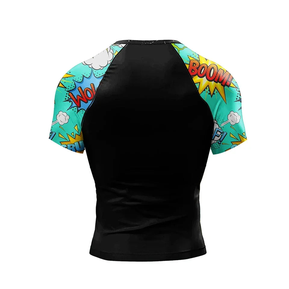 This compression set features high-density seams and smooth, chafe-free flatlock seam construction, ensuring durability and comfort no matter how hard you train. The bold comic print design stands out, making you look fierce while declaring your passion for the martial arts.