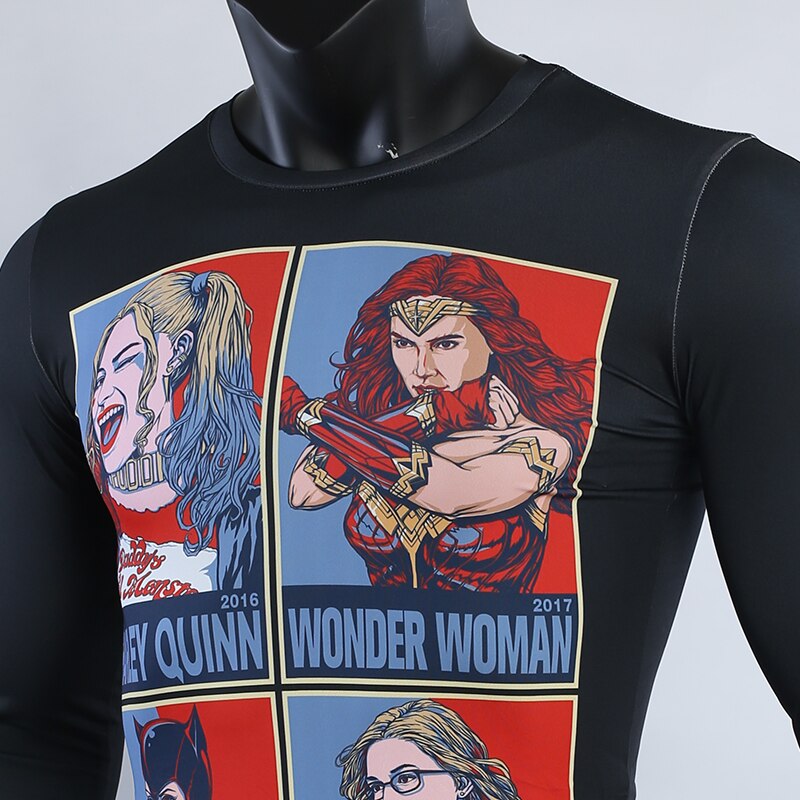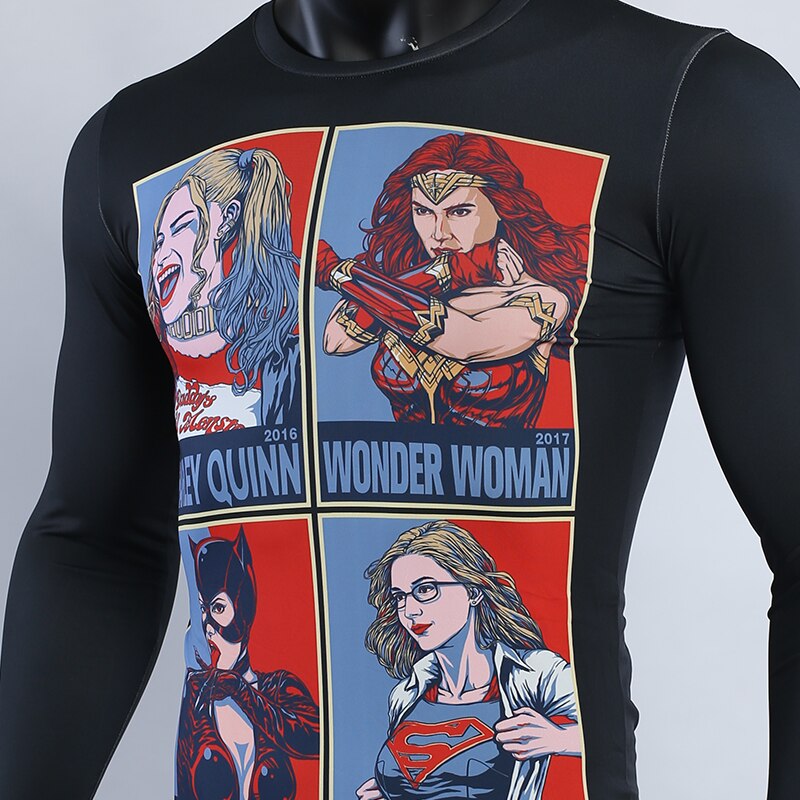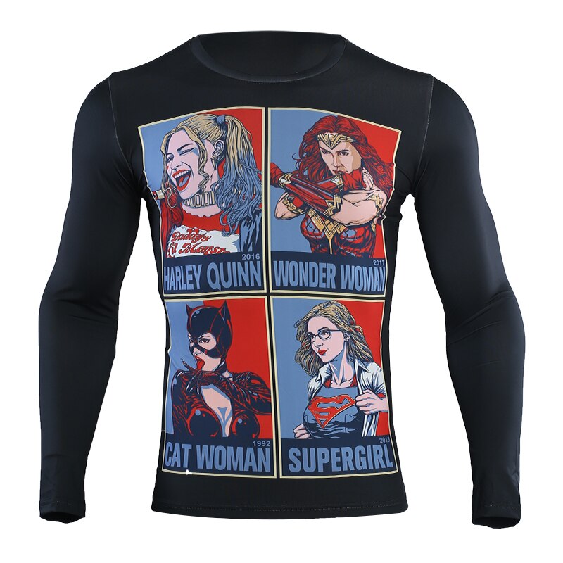 Introducing the Wonder Woman Compression long sleeve rashguard, featuring bold Catwoman, Supergirl, and Harley Quinn prints. Designed for athletes and fitness enthusiasts, it pairs performance with superhero style to help you train with confidence in the gym, on the mat, or at the beach.