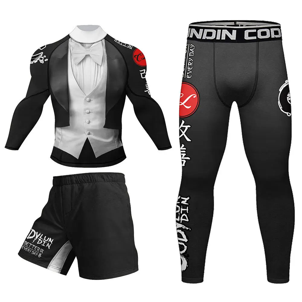 Introducing the Tuxedo Elite Compression Rashuard Set — formal-inspired performance wear for grapplers and gym enthusiasts. It blends refined style with high-performance fabric, perfect for BJJ, MMA, weightlifting, or any workout where you want to train with confidence and class.